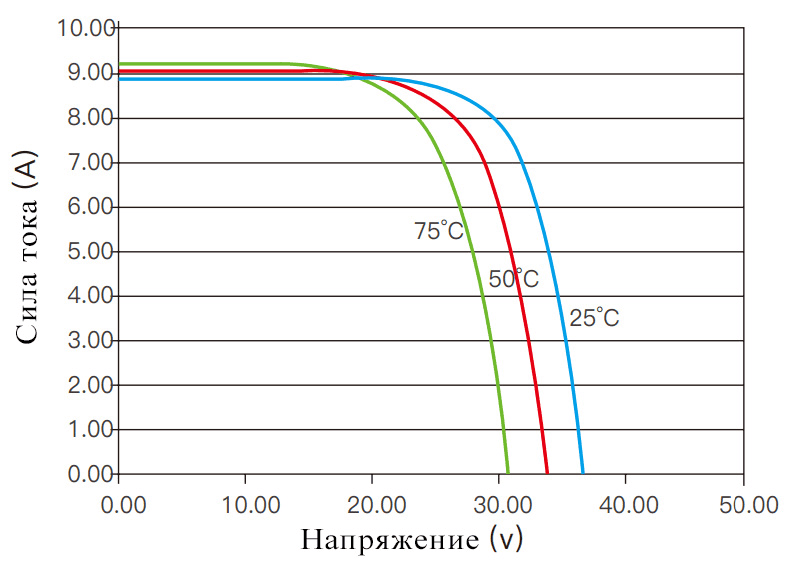 Для производства электроэнергии солнечным панелям необходимы прямые солнечные лучи. Наибольшую эффективность солнечная панель Einnova Solarline ESM-340S PERC показывает при низкой температуре окружающей среды. Все значения в паспорте измерены при стандартизованной температуре 20° C. На графике ниже показано эффективность выработки электроэнергии при изменении температуры окружающей среды.