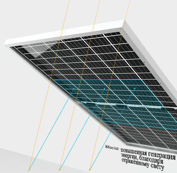 Обычные солнечные батареи генерируют электроэнергию только с одной стороны, так как их ячейки имеют, как правило, непрозрачную, полимерную подложку. Двусторонние устроены несколько иначе, что позволяет фотоэлектрическим ячейкам улавливать отраженный солнечный свет и задней поверхностью. При условии, что массив батарей устанавливается на поверхности с высокой отражающей способностью (белая кровля, песчаный или каменистый светлый грунт или еще лучше - снег), производительность двусторонних солнечных батарей может быть на 25% выше, чем у стандартных. В итоге к заявленной мощности панели мы можем получить до 25% дополнительной выработки.